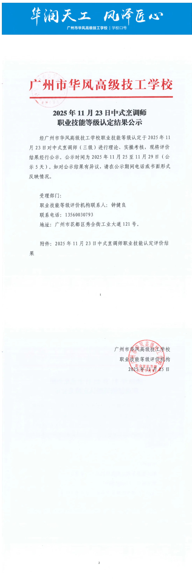 关于广州市华风高级技工学校2025年11月23日中式烹调师职业技能等级认定评价结果公示的通知