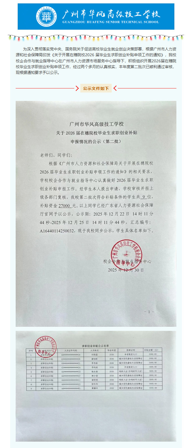 广州市华风高级技工学校2026届毕业生求职创业补贴通过审核名单公示(第二批)