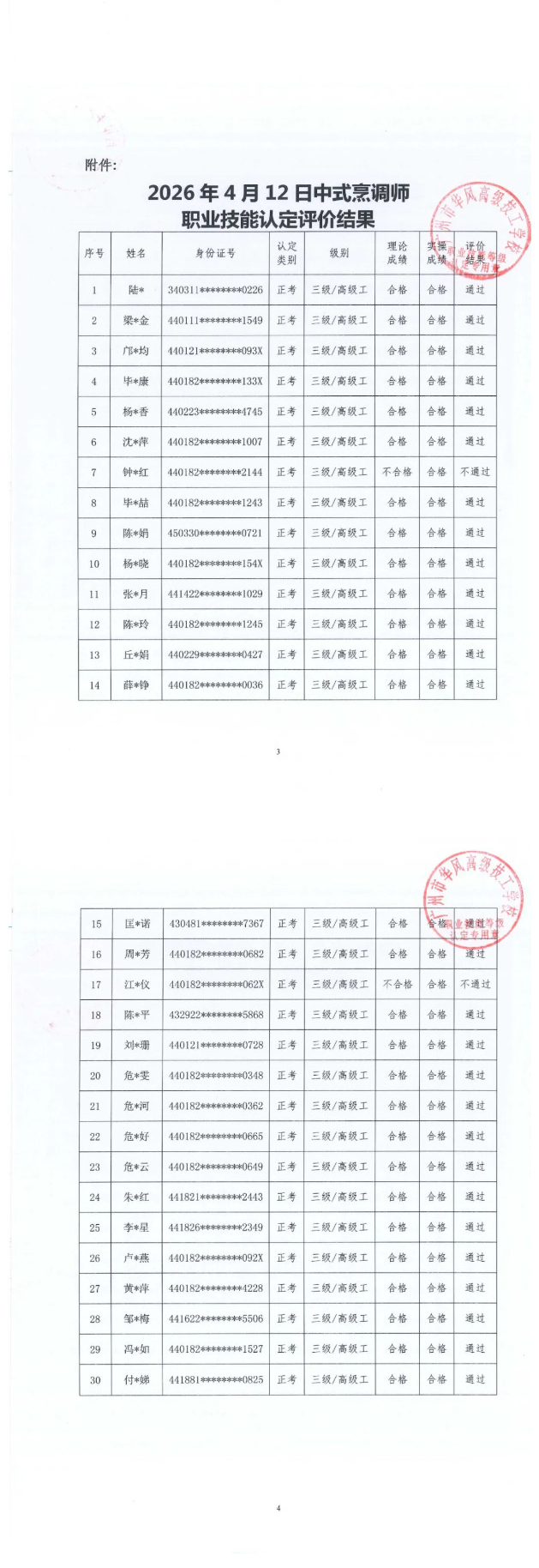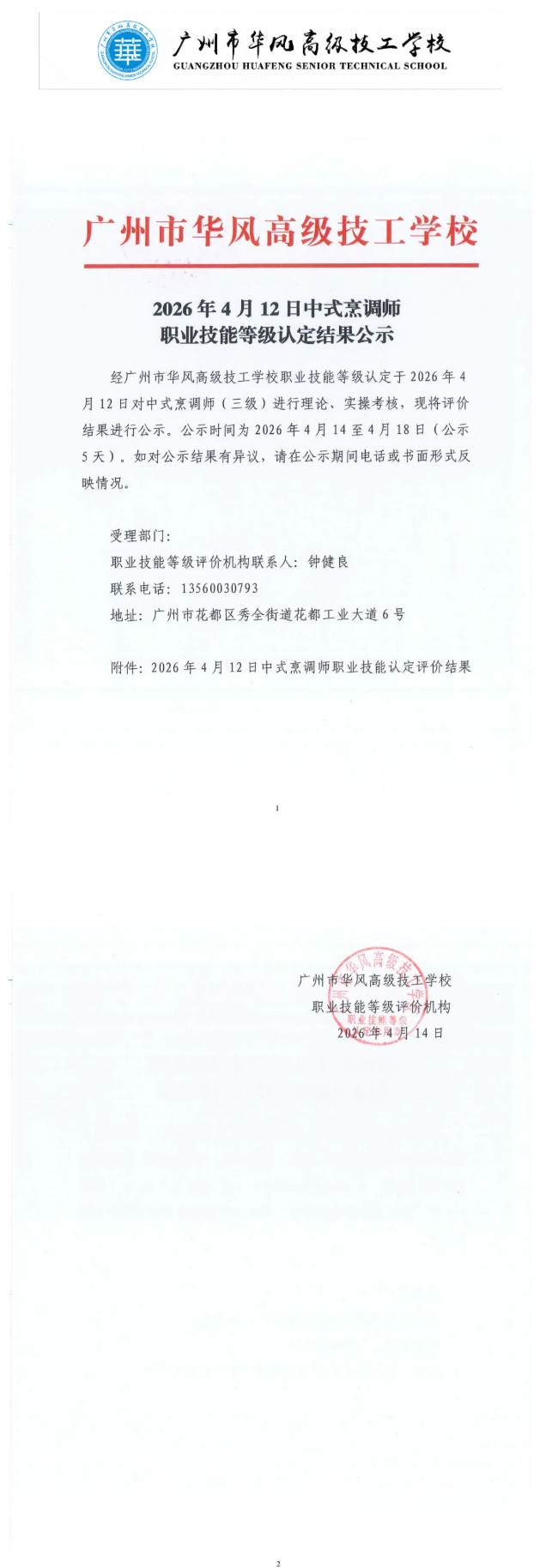 关于广州市华风高级技工学校2026年4月12日中式烹调师职业技能等级认定结果公示的通知