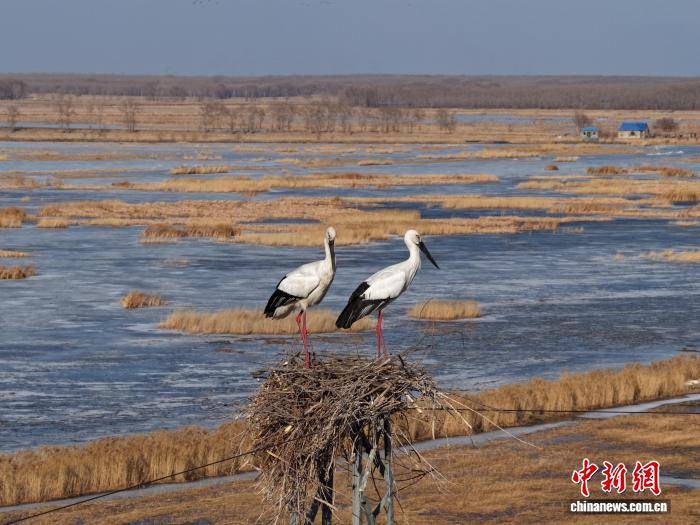 3月16日,吉林镇赉,一对西方白鹳正在莫莫格(ge)湿地(di)的巢中休憩。 潘晟昱(yu) 摄
