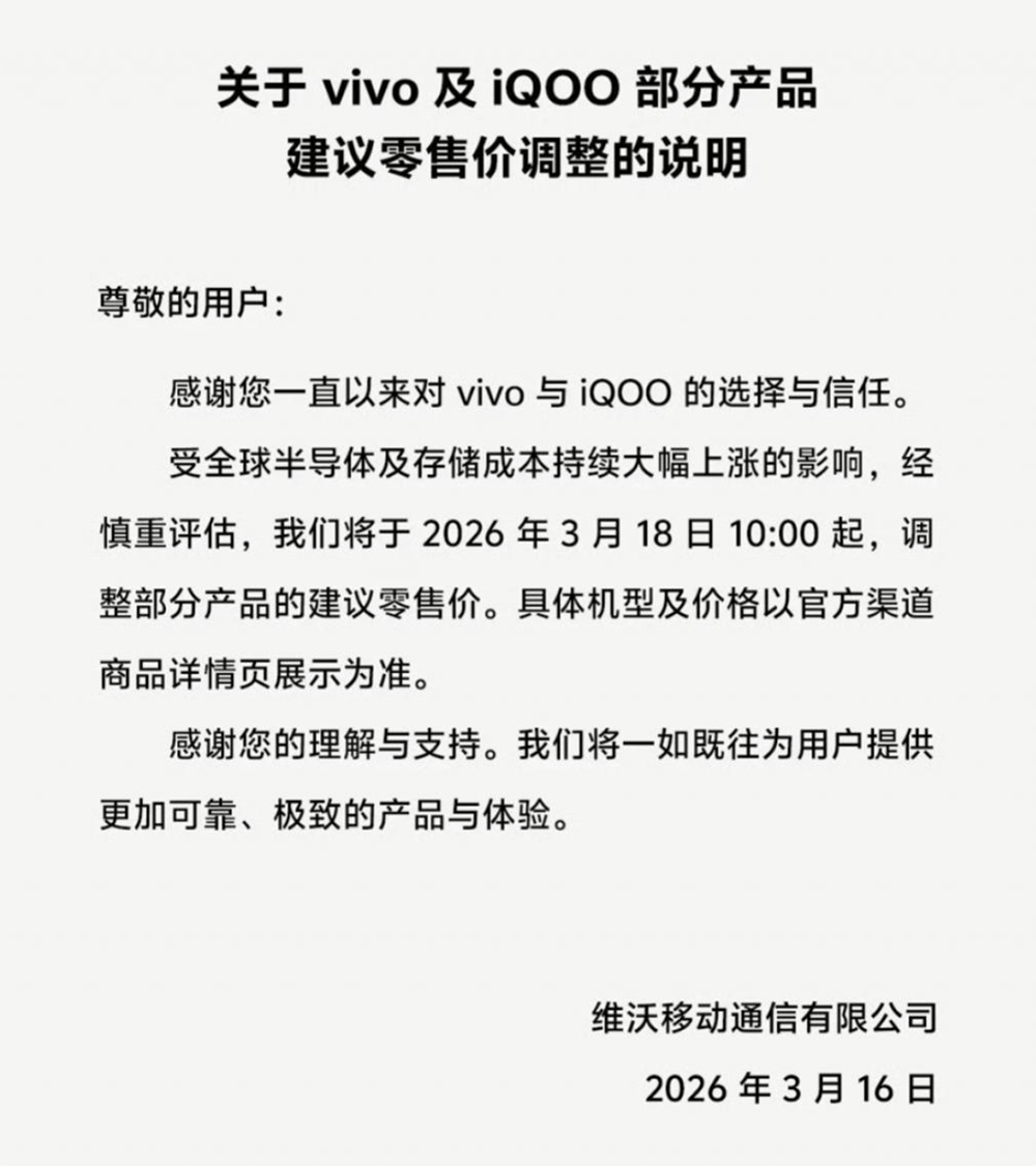 3月16日,vivo在官方社区发布公告称,受全球半导体及存储成本持续大幅上涨的影响,经慎重评估,公司将于2026年3月18日10:00 起,调整部分产品的建议零售价。具体机型及价格以官方渠道商品详情页展(zhan)示为(wei)准。