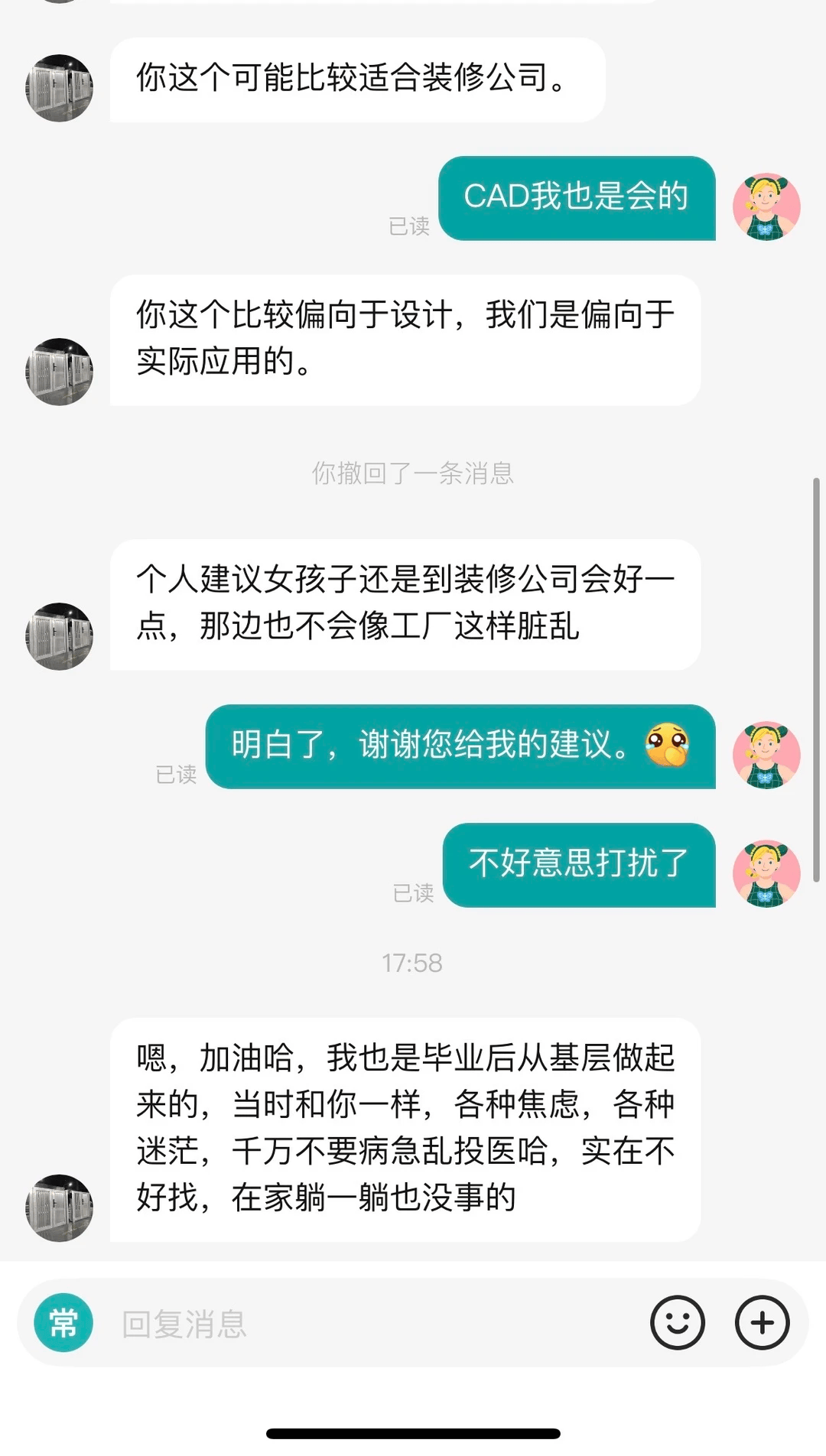 原来,事发前两(liang)天,她(ta)因家(jia)里催(cui)得紧,投了约50家(jia)公司的岗亭。“软件上大部分的HR都是已读(du)不回,大概是连看都不看。我的精力高度紧绷、极度焦急。”她(ta)正在(zai)小红书上分享了这段履历,“看到(dao)他的暖心话语后,真的一(yi)下子没绷住哭了出来。”
