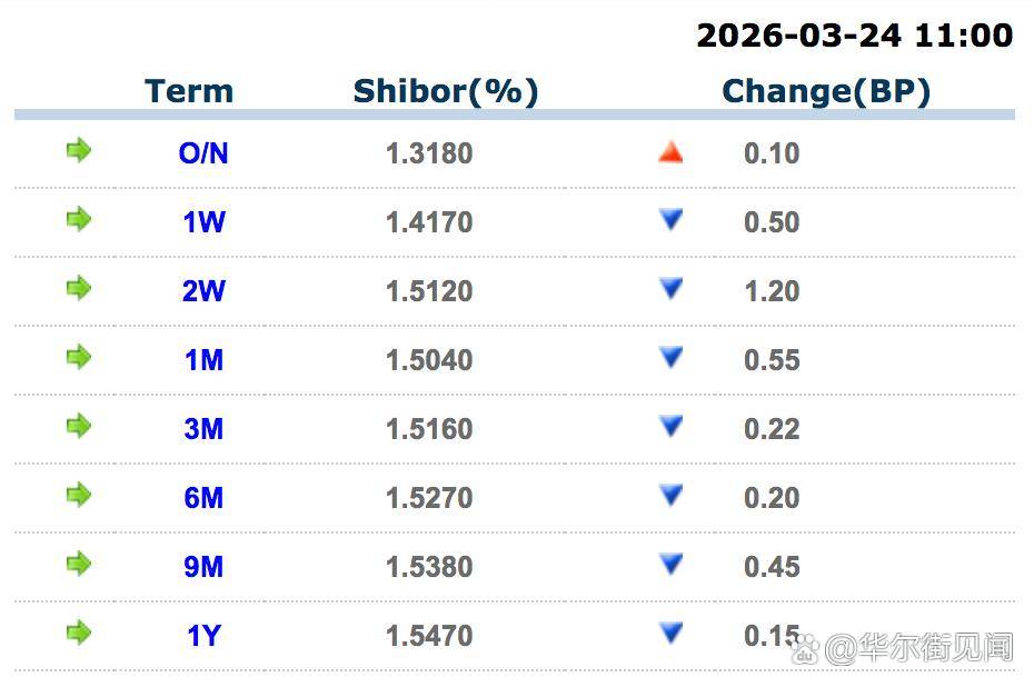 隔夜SHIBOR报1.3180%,上涨0.10个基点。