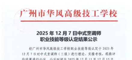 关于广州市华风高级技工学校2025年12月07日中式烹调师职业技能等级认定评价结果公示的通知