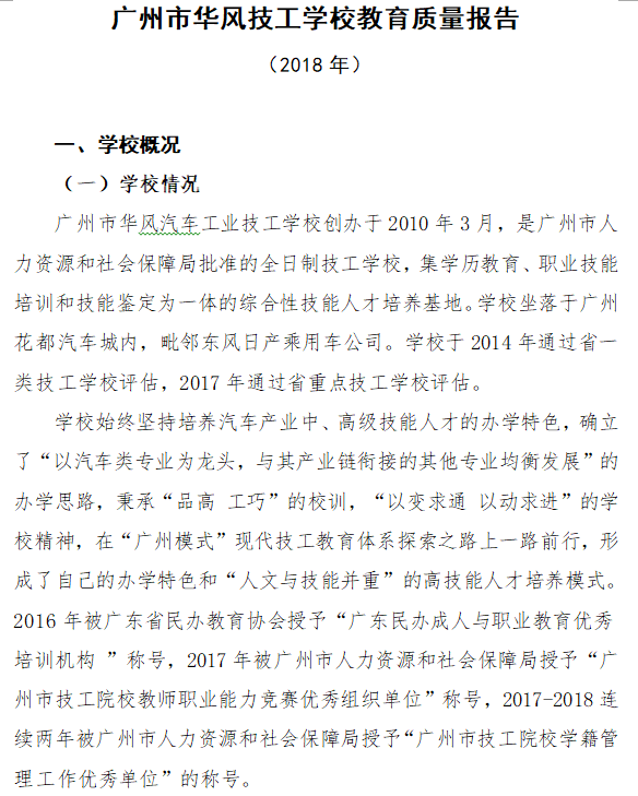 广州市华风汽车工业技工学校创办于2010年3月,是广州市人力资源和社会保障局批准的全日制技工学校,集学历教育、职业技能培训和技能鉴定为一体的综合性技能人才培养基地。学校坐落于广州花都汽车城内,毗邻东风日产乘用车公司。学校于2014年通过省一类技工学校评估,2017年通过省重点技工学校评估。...