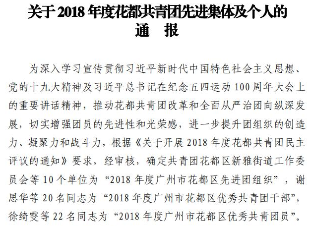 五四运动100周年之际,共青团花都区委员会发布关于2018年度花都共青团先进集体及个人的通报,我校团委刘彬彬老师荣获“花都区优秀共青团员”称号。...