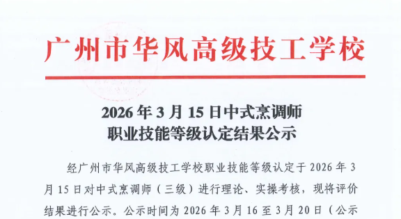 关于广州市华风高级技工学校2026年3月15日中式烹调师职业技能等级认定结果公示的通知
