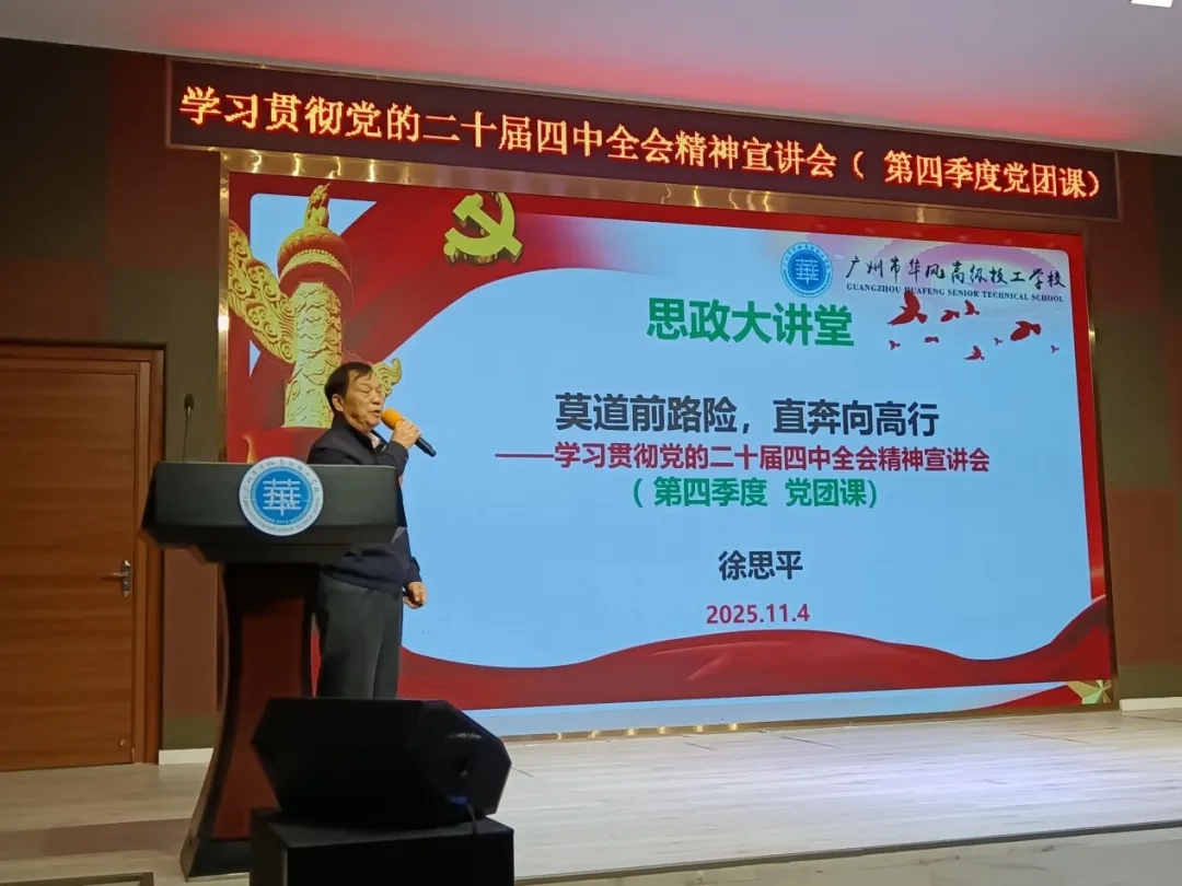 2025年11月4日下午,广州市华风高级技工学校以思政大讲堂之名,举办了一场“学习贯彻党的二十届四中全会精神”的宣讲会暨今年第四季度党团课。全体党员、入党、入团积极分子与校团委、学生会干部、没有上课的老师齐聚一堂,聴听了学校党支部、校长徐思平的宣讲。...