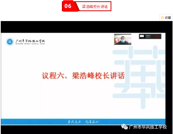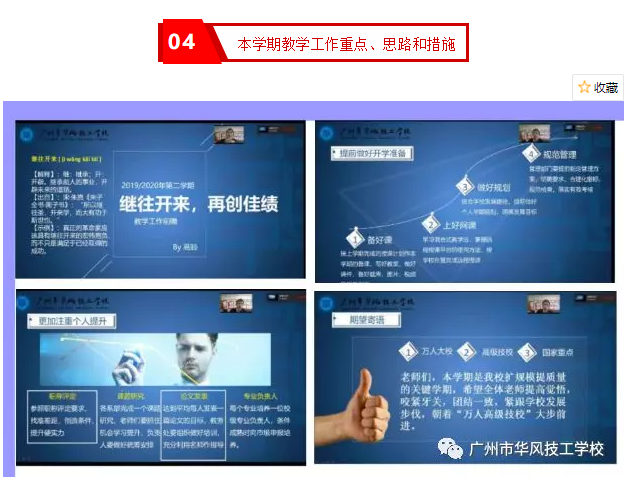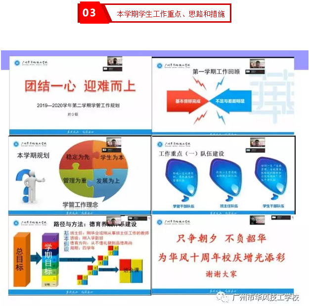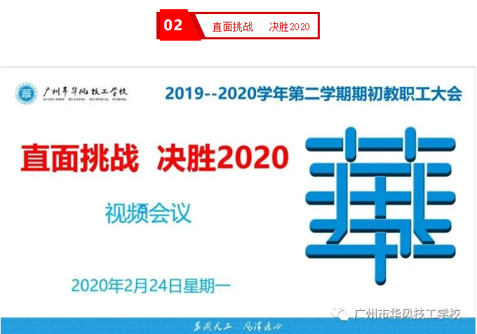 2020年新冠肺炎疫情改变了我们的生活方式、学习方式和工作方式,但不能改变华风人向着万人大校和品牌学校前进的步伐。今天站在建校十周年新的起点上,我们要以变求通、以动求进,直面挑战、决胜2020。2020年2月24日上午九时,我校在企业微信直播平台上召开了2019-2020学年第二学期期初教工大会,全体教职工在家通过直播平台参加了会议,会议共六项议程。