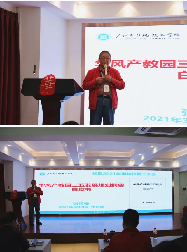 2021年是我国“十四五”规划的开局之年、也是华风“三五”规划(2021—2025)的开局之年、更是华风第二个十年的开局之年。为顺利开局,在元月12日华风2021年度工作会议成果基础上,我校于2021年3月2日上午在学校报告厅召开2020—2021学年度第二学期新学期全体教职工大会,发布华风产教园“三五”发展规划《白皮书》、《红皮书》、《蓝皮书》,明确指出华风产教园发展路径,签订安全责任状,部署新学期教学与学生线重要工作,并投票选举华风工会主席及委员。