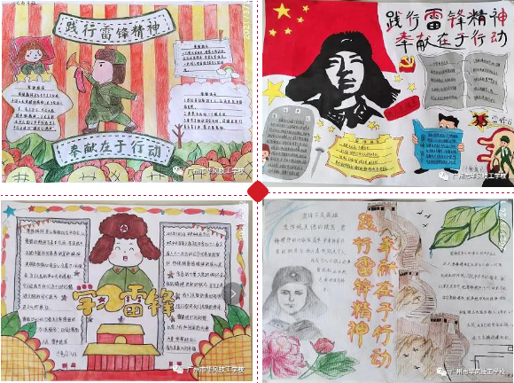 各班级利用课余时间,积极寻访身边的“雷锋”,了解他们的感人事迹,学习他们的精神品格,开展专题手抄报绘画。