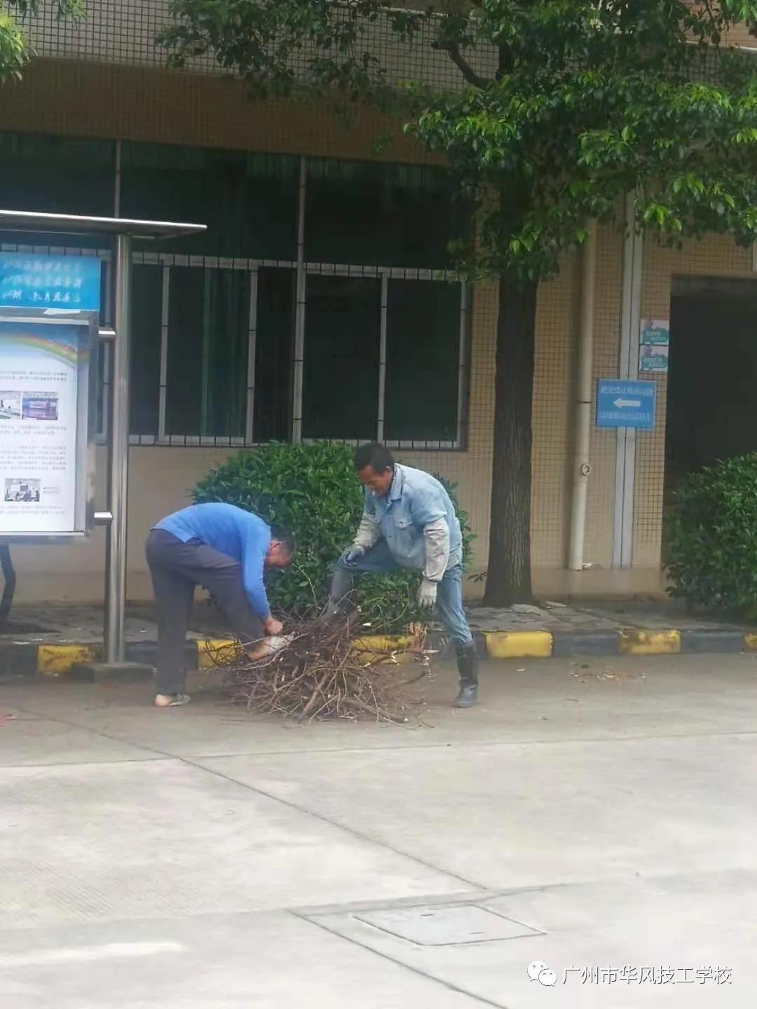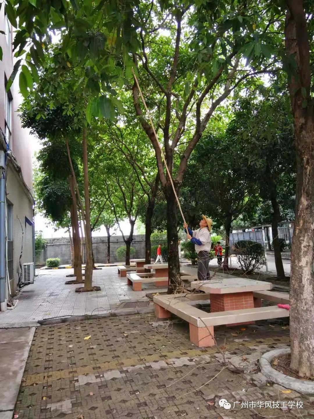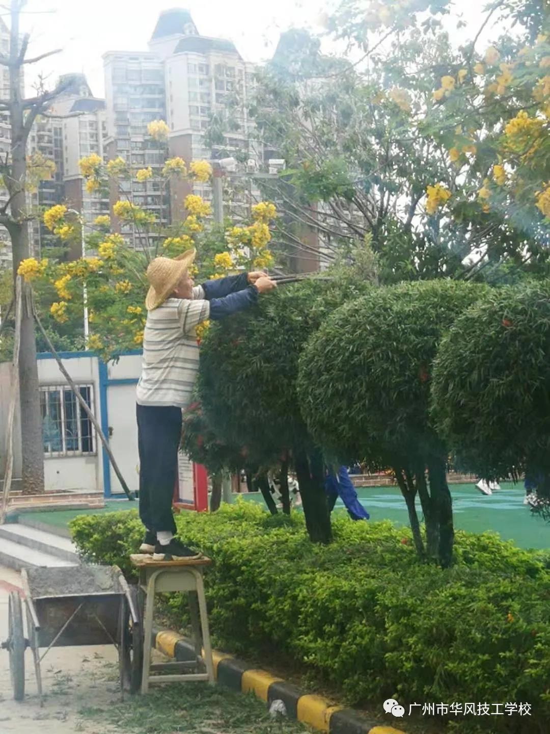 不同的季节你会发现我们的校园环境也呈现着不同的美,为加强校容校貌建设,大力提升校园绿化水平,近期,后勤绿化组的工作人员也是一直马不停蹄的对校园各类植物进行洒水、修剪、除虫、施肥等管理工作。由于目前处在春末夏初之际,前期的春雨使校园植物枝繁叶茂,同时也有部分干枝败叶残留在树上。考虑到后续可能遇到大风天气容易发生树枝掉落,树枝修剪不及时存在一定安全隐患,绿化组的工作人员这二天针对校园内干枯树枝以及树冠挡住照明物或监控的情况进行了清理,以保障在校师生的人身与财产安全。