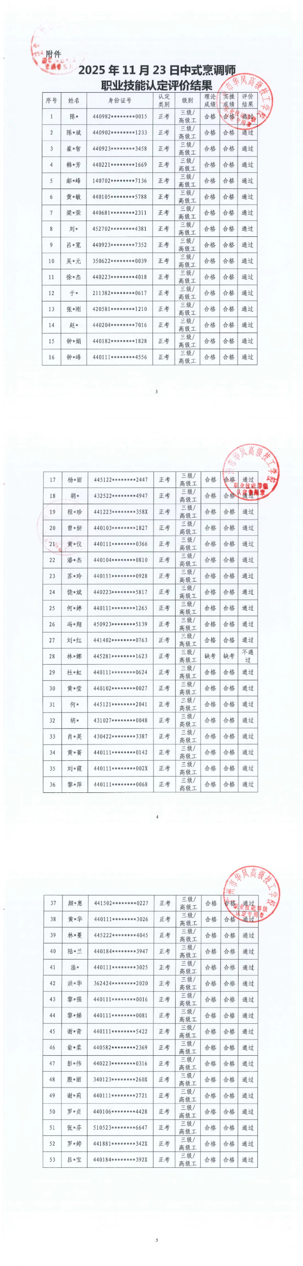 关于广州市华风高级技工学校2025年11月23日中式烹调师职业技能等级认定评价结果公示的通知