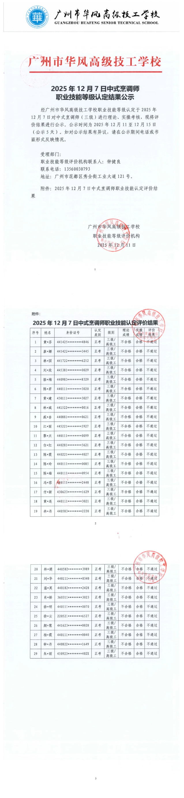 关于广州市华风高级技工学校2025年12月07日中式烹调师职业技能等级认定评价结果公示的通知